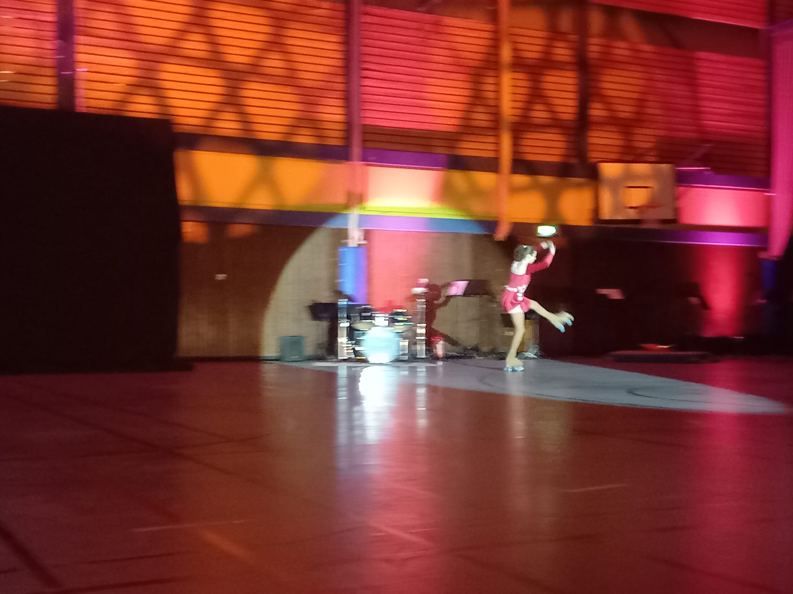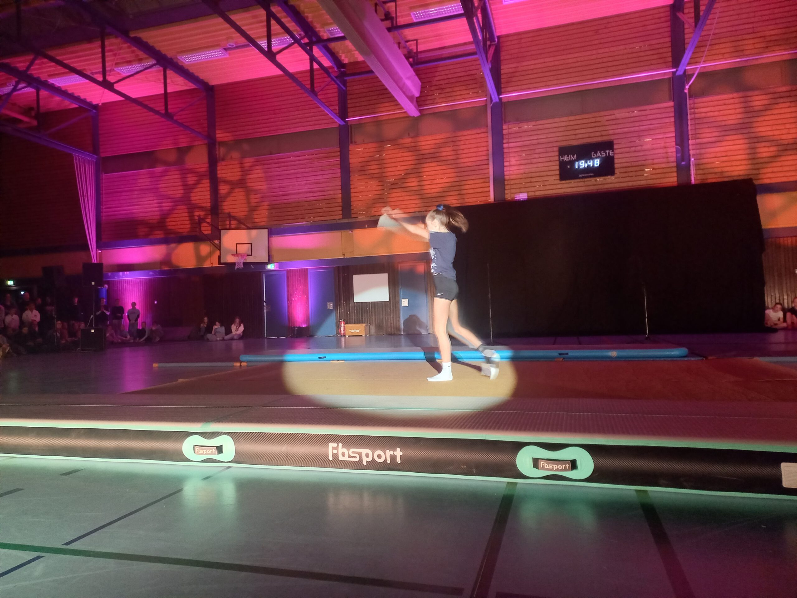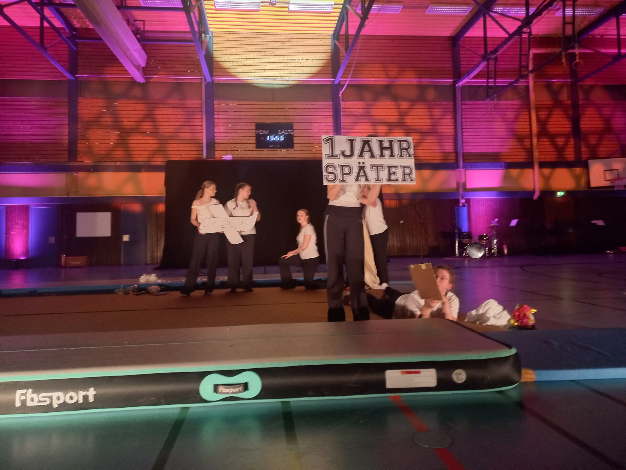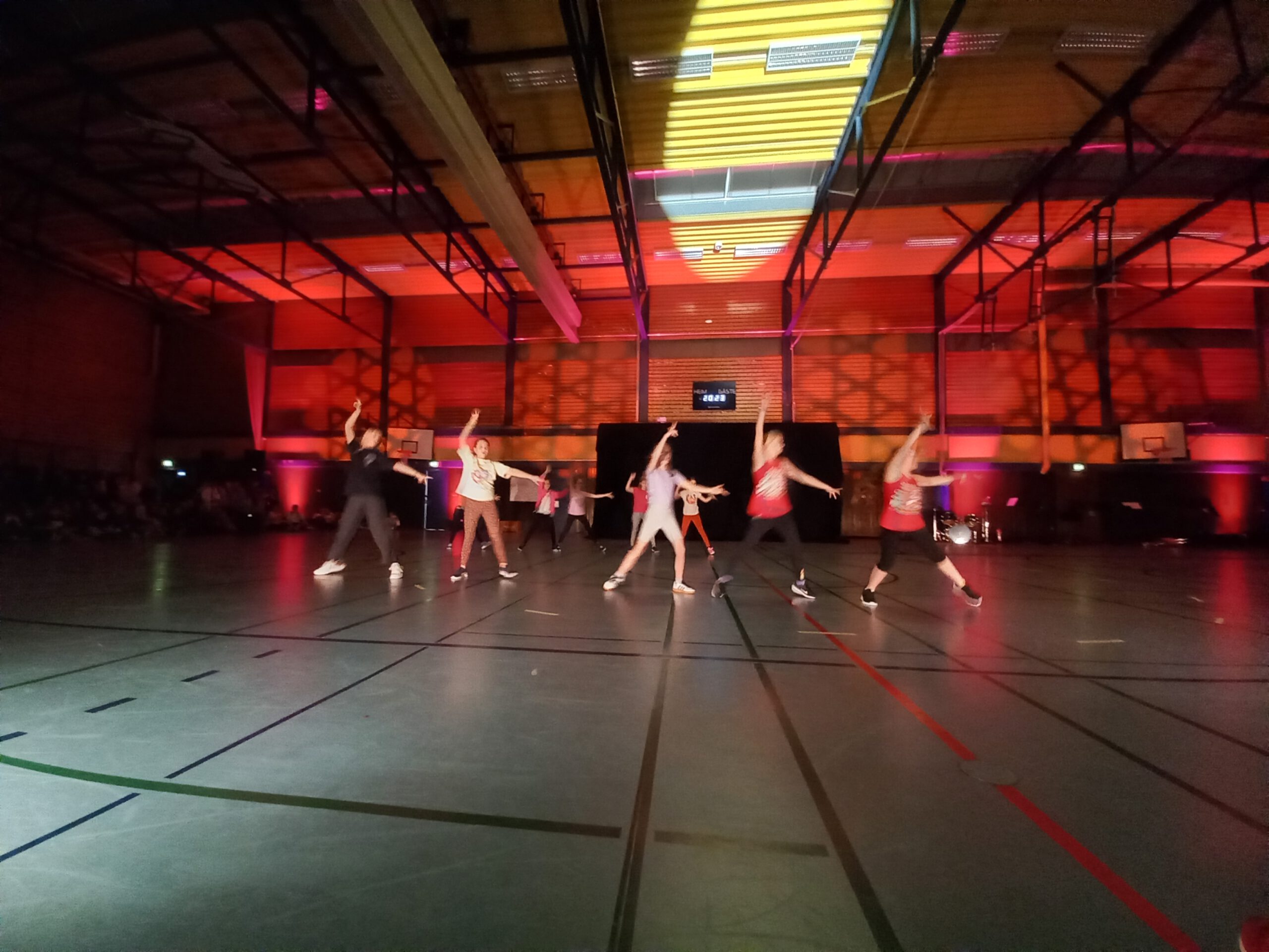 Im zweiten Teil des Abends verlagerte sich das Geschehen in die Sporthalle, wo ein abwechslungsreiches Bühnenprogramm wartete. Die Zuschauerinnen und Zuschauer konnten sich über Musik, Tanz und beeindruckende Beiträge mit Kampfsportelementen freuen. Atemberaubend waren besonders die Darbietungen der Turnerinnen sowie der Kunstradfahrerinnen und Rollkunstläuferinnen, die zeigten, welch hohes Leistungsniveau an unserer Schule vertreten ist.