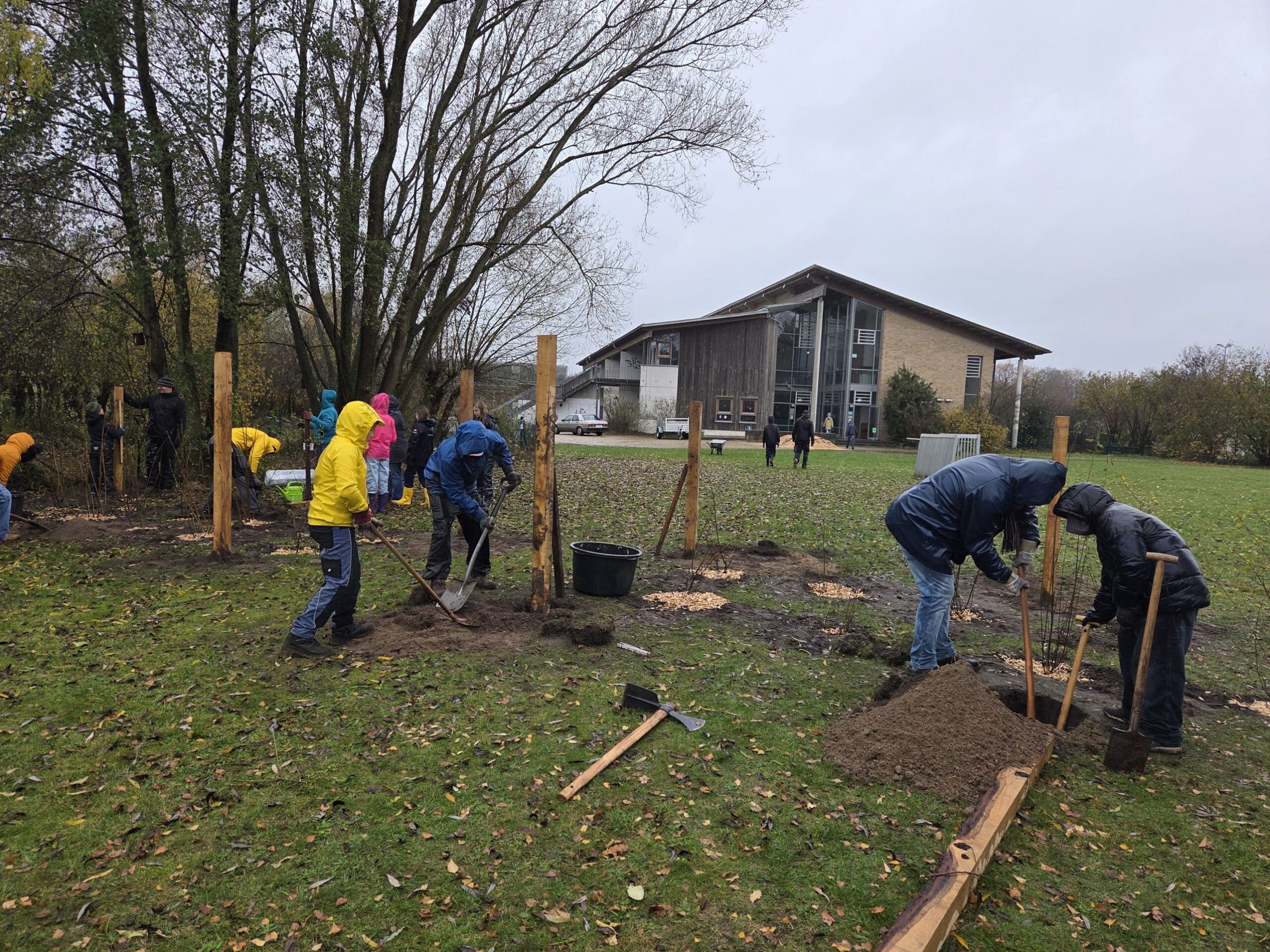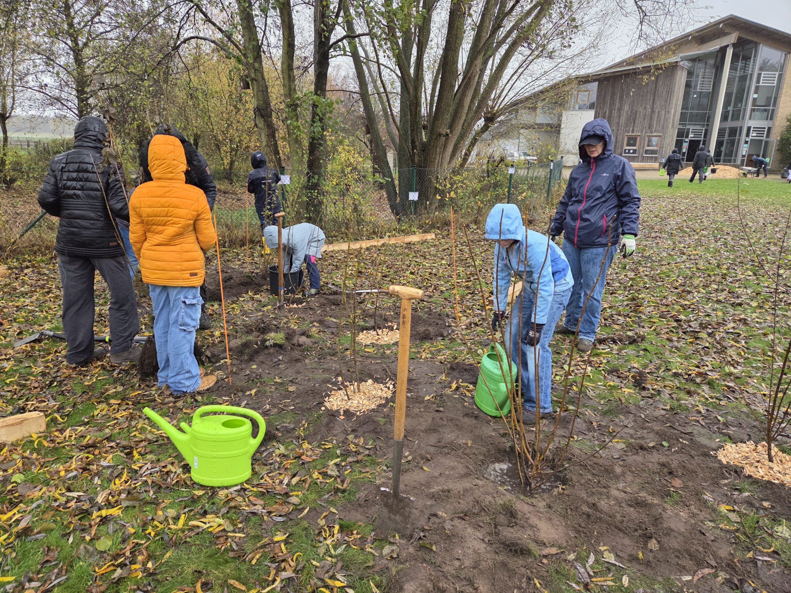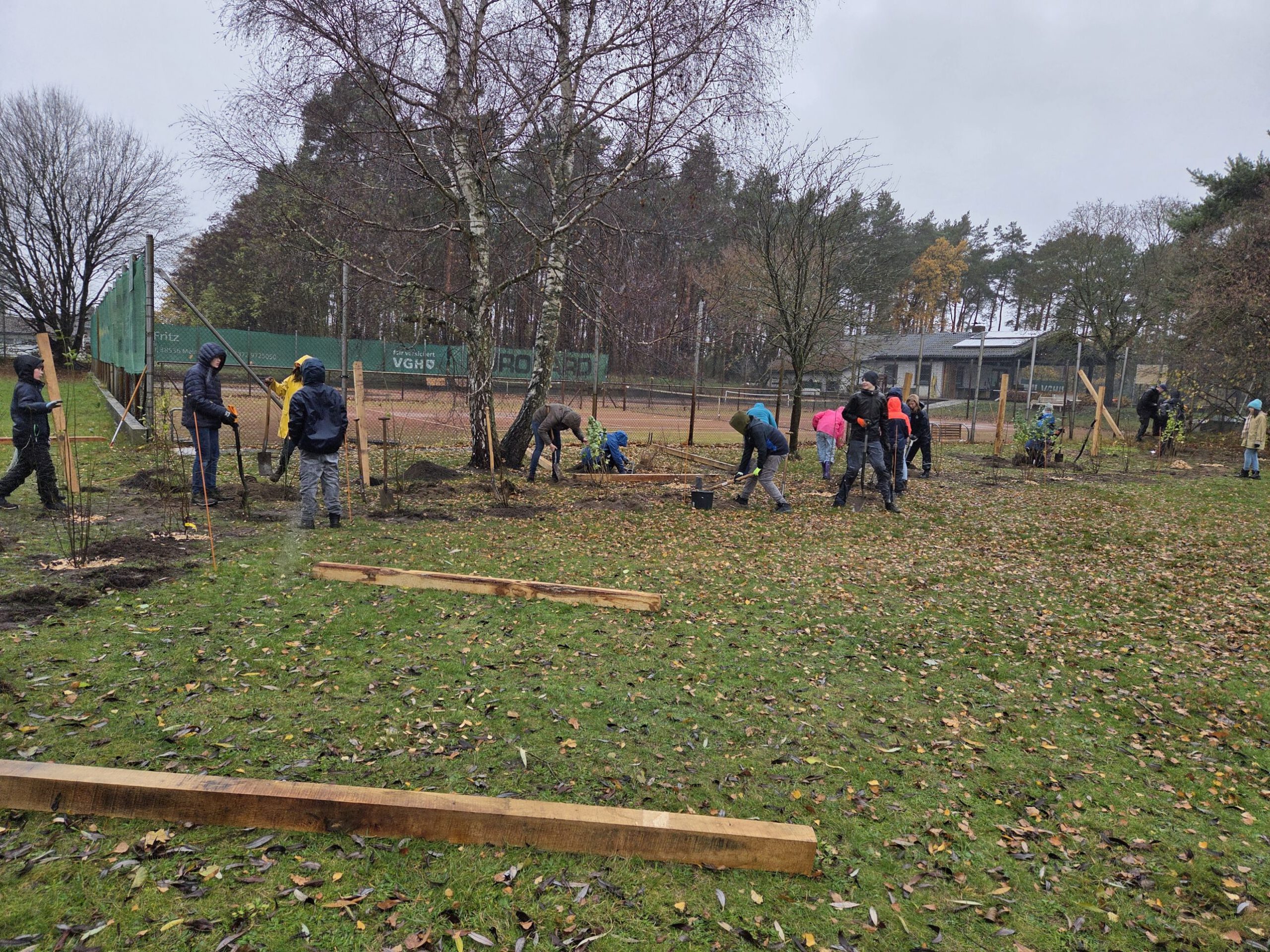 Leiferde - Am Samstag, den 15. November 2025, fand die erste große Pflanzaktion unseres Schulprojekts „Minidrachenland“ statt – und das trotz teilweise starken Regens. Mehr als 40 Eltern und Schülerinnen und Schüler der naturkundlichen AGs kamen am Morgen zusammen, um die neuen Schulflächen in Leiferde naturnah zu gestalten.